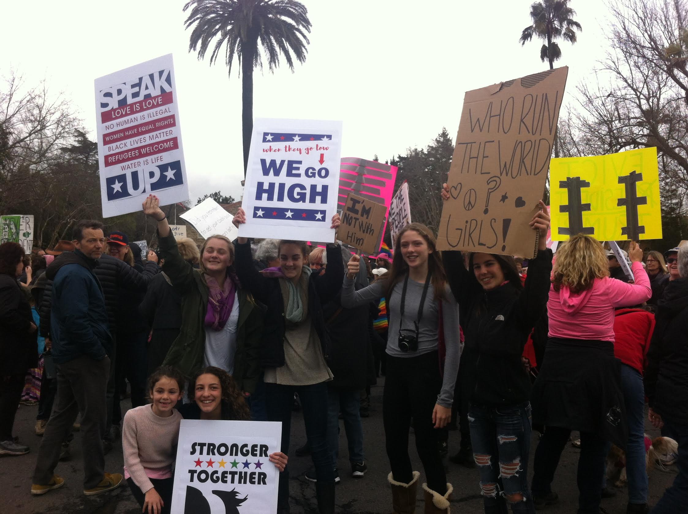 As the marchers started to break up and head home, many thanked the police on their way out. The March was notable for its polite tone and civility, and for the unprecedented crowd, estimated by law enforcement to be around 3,000. Also exceptional was the broad range of our community represented. Groups representing the Latino, LGBT, and feminist communities joined forces with the March, as did the First Congregational Church Social Action Committee, La Luz, the Peace & Justice group, and others. Many noted the large number of seniors, as well as children, who were carrying some of the day’s most singular signs, including “Mermaids Against Misogyny,” “Feminist in Training,” and “Dumbledore wouldn’t have allowed this to happen.”
