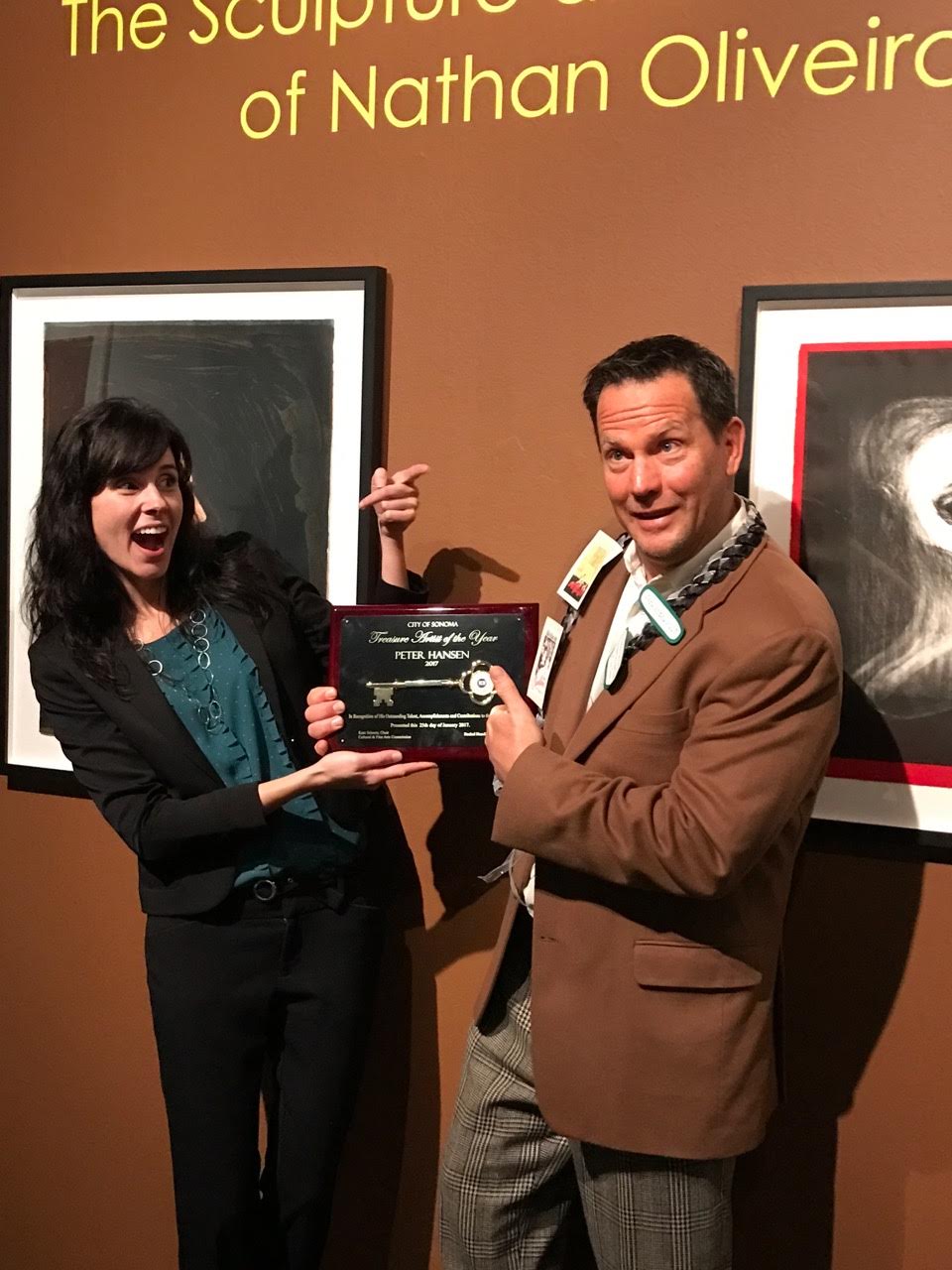 Sonoma Mayor Rachel Hundley presents media instructor Peter Hansen as the city’s Treasure Artist for 2017 at reception Wednesday night.