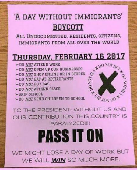 The protest calls for a boycott of all purchases for the day, and urges immigrants to skip work and miss school. The goal is to show the importance of immigrants to the U.S. economy. As one online flier reads, “Without us and our contribution this country is paralyzed.”