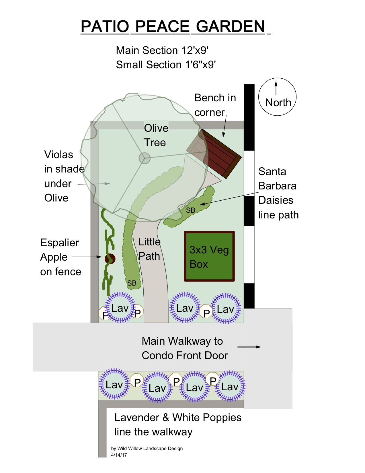 The peaceful garden sketch is based on the real-time square footage of a condo patio here in Sonoma.