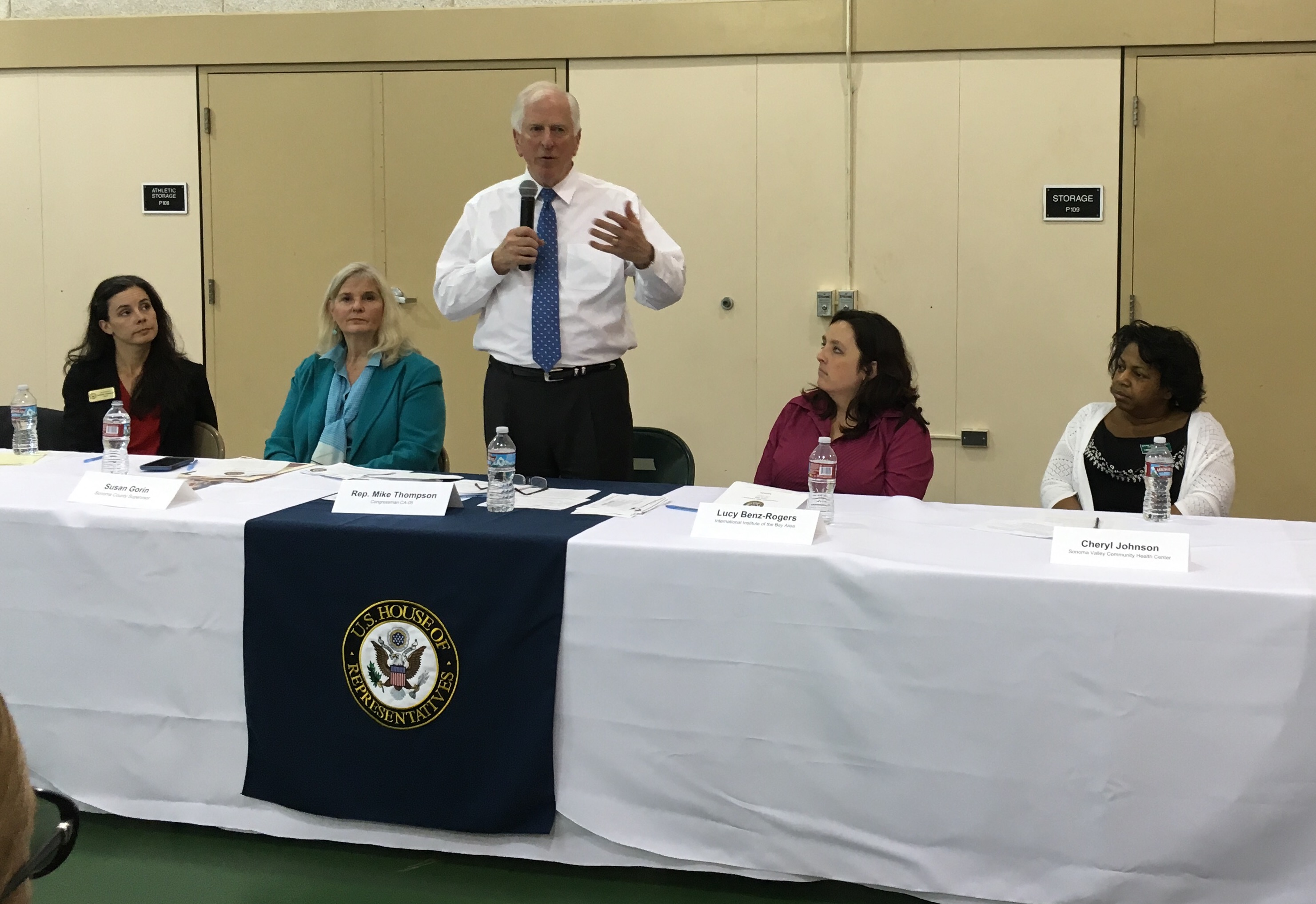 Flanked by representatives of local government and services, Representative Mike Thompson (D, 5th District) hit hard on topics of health care, immigration, Trump’s appointees, tax cuts, the budget, and Federal funding for state and county programs at his town hall meeting Thursday.
