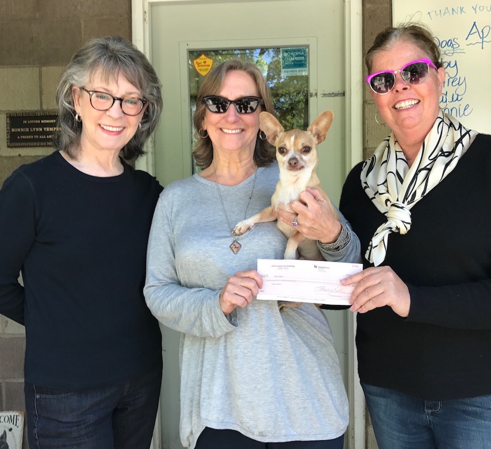 Proceeds from the sale of works of a gallery show at Sonoma Arts Guild are presented to Nancy King, center, of Pets Lifeline, by the Guild’s Jackie Lee, at left, and Gail Duffley.