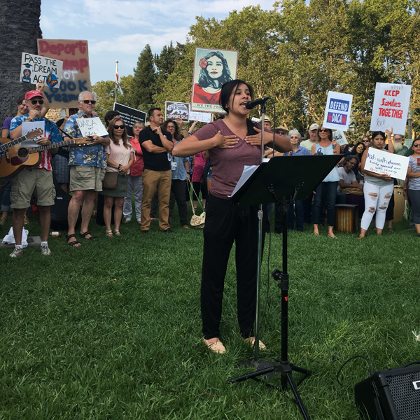 An ebullient, caring community of more than 250 Sonomans rallied in the Plaza on Wednesday, September 6th in support of the Dreamers, the young people given a reprieve and some opportunities under former president Obama’s Deferred Action for Childhood Arrivals program, or DACA. The rally was co-sponsored by the Sonoma Valley Democrats and Resist Sonoma in response to the Trump administration announcement the day prior that DACA would be eliminated in six months. The atmosphere was enthusiastic as ralliers, the majority from the Anglo community, gratefully embraced the opportunity to stand up and be counted with regard to this action by the present White House.