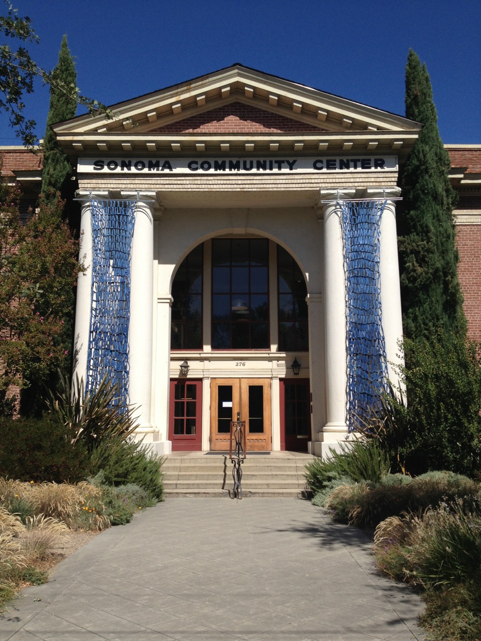 The staid and stately Sonoma Community Center has accessorized, adding a fiber art installation to its iconic facade.