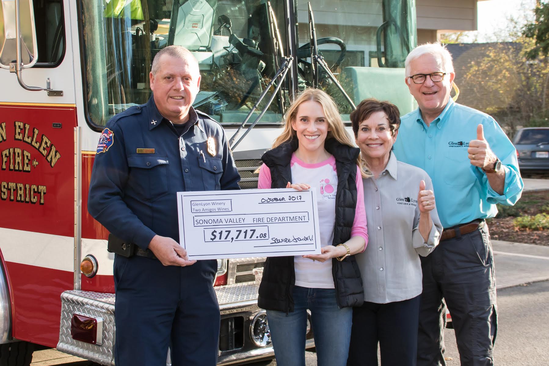 Squire Fridell, past president of the Sonoma Valley Vintners and Growers Alliance (at right) proudly watches as wife Suzy and daughter Lexy hand off a check for $17,771 to Bob Norrbom, Sonoma Valley Fire Department Battalion Commander.