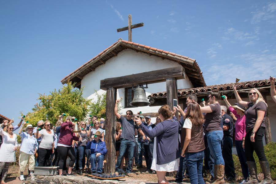 The first grape pick of the season — about 20 tons of Pinot Noir from Sangiacomo Family Vineyards — is celebrated with a bell-ringing Wednesday at the Sonoma Mission. The ringing in of the 2018 harvest was commemorated by growers, vintners, the local wine community, first responders, and local officials in the event organized by the Sonoma Valley Vintners & Growers Alliance (SVVGA).