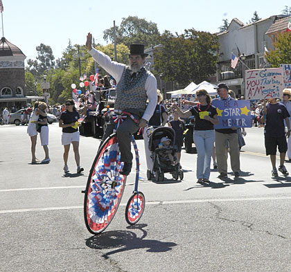 The Parade of 60+ entries — vintage cars, horses, floats, community and kids groups, fire trucks, and at least one unicycle — begins at 10 a.m. winding its way around the Plaza.