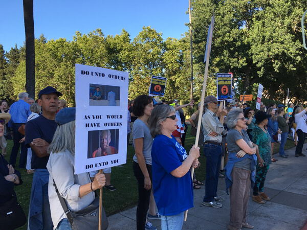 Well over 100 local citizens assembled at Sonoma Plaza Friday evening at 6 p.m. to raise their voices and wave signs in protest of the Trump administration’s internment policies. Hosted by La Luz, the demonstration lasted for one hour, and drivers passing the Plaza signaled their approval by honking their horns in support. A petition drive was announced urging Sonoma’s City Council to approve a proposed resolution opposing the camps confining asylum-seekers and others apprehended after crossing the border; it can be found at Change.org.
