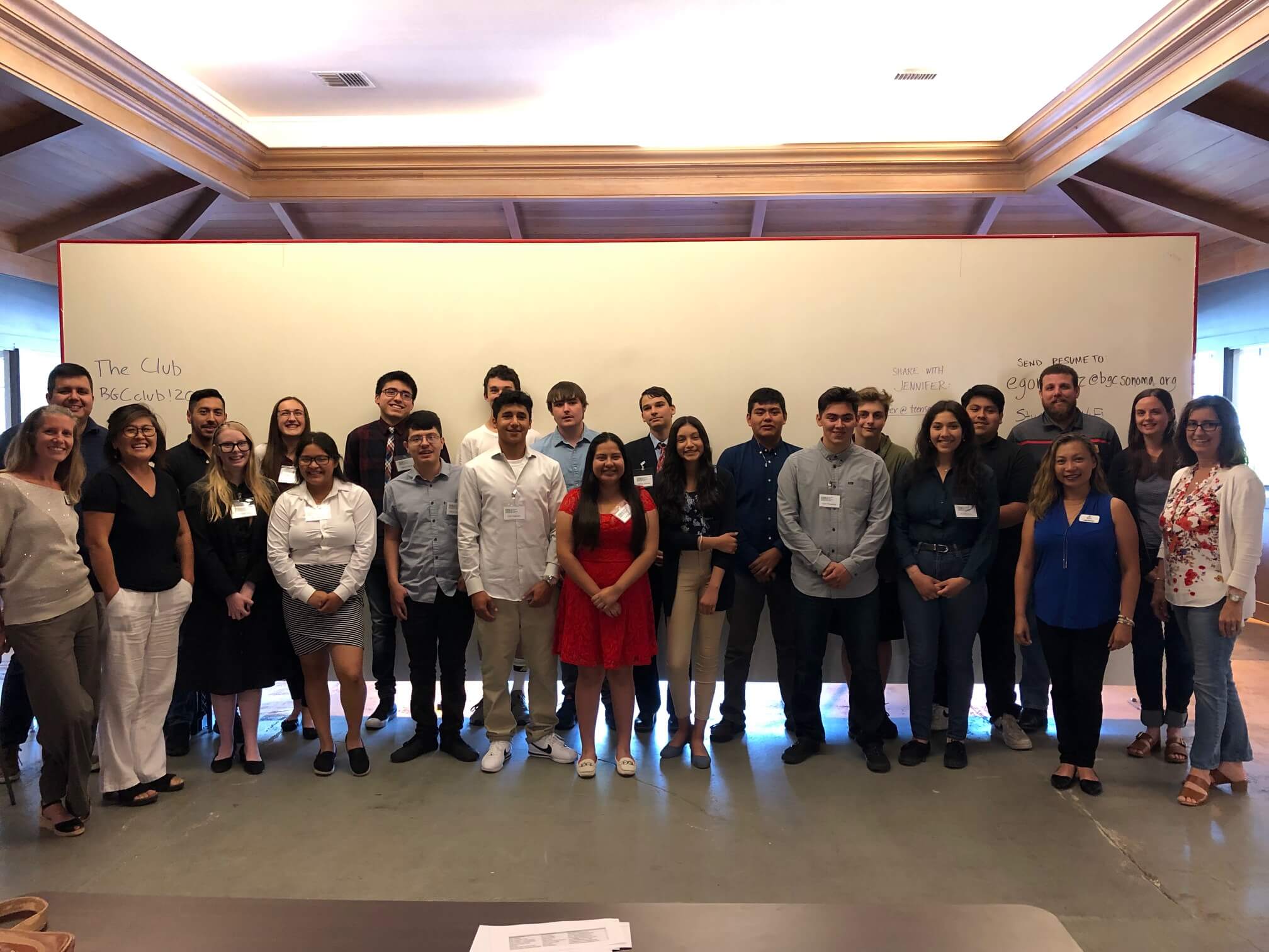 A class of 16 teenagers marks completion of a Teen Services Sonoma summer Work Readiness Certification course at The Club in Maxwell Village. Funded by a Community Grant from Impact100 Sonoma, the program teaches skills needed to enter the job market: the application and hiring process, money management, and customer service; writing a resume; and mock job interviews with local business professionals.