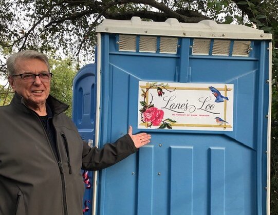 Bill Norton presides over the dedication of a new portable toilet outside the The Haven, the Sonoma Overnight Support homeless shelter in Sonoma. Dubbed “Lane’s Loo,” the unit is a legacy gift from the late Lane Norton, his wife, an ardent supporter.