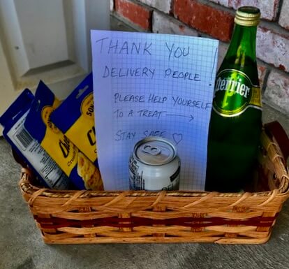 In the age of shelter-in-place, thank goodness for home delivery. To thank the folks that bring what she needs to her home, Jackie Lee created this space-appropriate treat station on her front porch.