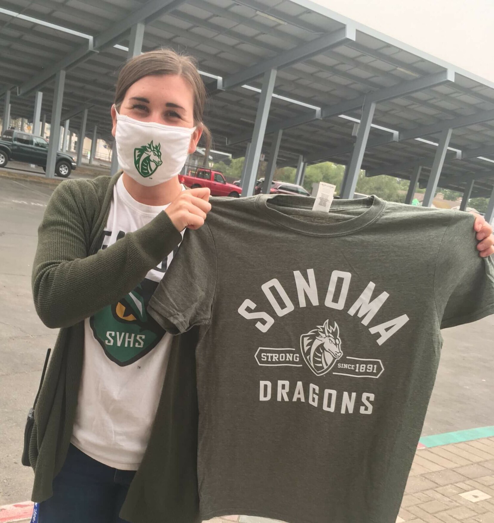 Shawna Hettrich, Sonoma Valley High School vice principal, shows off new Dragon gear (note the mascot-logo face mask) on the school’s recent Distribution Day, as every student received a box of free supplies to aid online learning. The stash included everything from graph paper and pencils to calculators and protractors, part of a district-wide program created in partnership with The Sonoma Valley Education Foundation, Sonoma Valley Community Health Center, and La Luz. The drive-up, walk-through event mixed in a booster raffle, textbook pick-ups, and some valuable social (properly distanced) interaction for the teens.