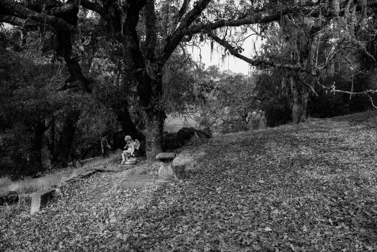 A little guardian angel watches over the grounds, head gently bowed, wings gently folded. She sits in the shade of some old oaks just uphill from the gate. One of the trees has listed, its limbs resting in the embrace of a sister oak that offers steady support, for now. It’s hard to know how long the embrace will last, given how precarious it appears, and the angel looks like she’ll be crushed if the tree falls. But walk down to the sunken vault where the cremains are interred, and you’ll see she’s perched between where the twin trunks will land. It’ll be a narrow miss.