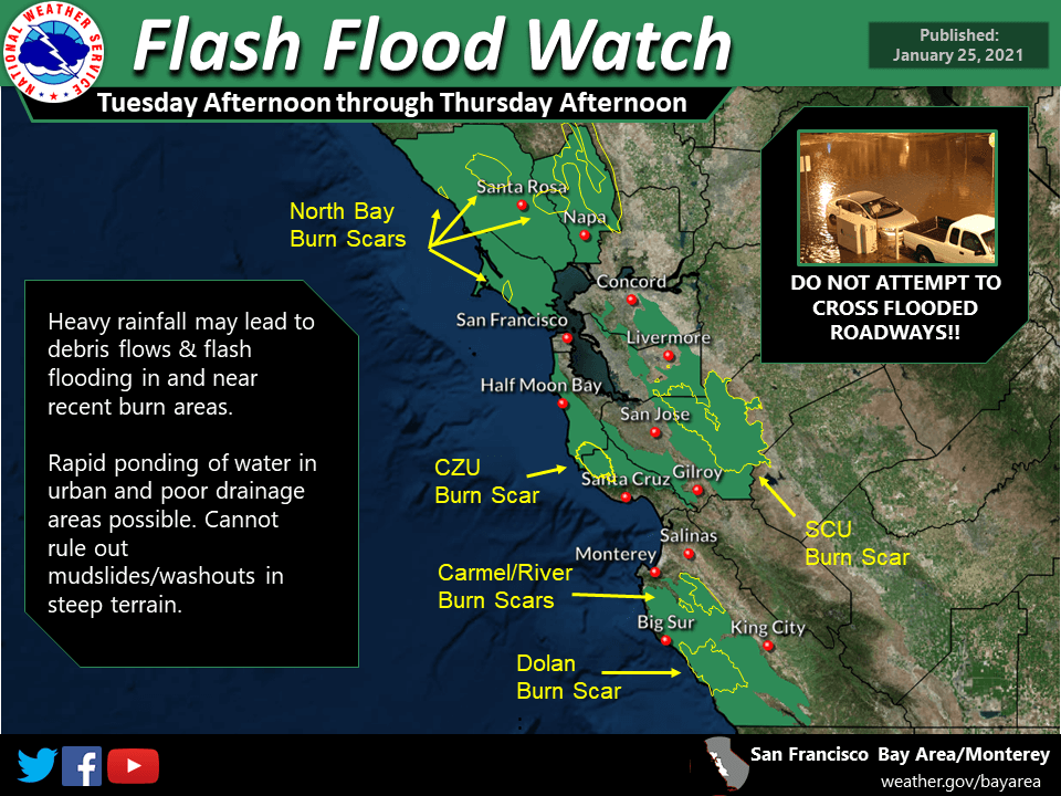 Of particular concern are areas downstream from the Kincade, Walbridge, Meyers, and Glass Fire burn scars.