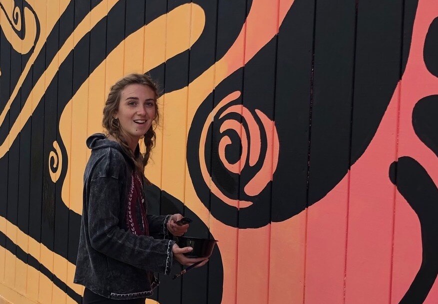 A bright, bold design now expressed as two huge outdoor murals started out, admits the artist Elsa Winter, as a doodle. A small drawing speaking to big themes, one that would ultimately be “supersized” by a crew of student volunteers.