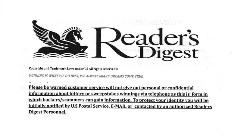Advice on dodging sweepstakes scams like this are pretty basic. First and foremost, if you’ve never entered a sweepstakes contest, you can’t win. Despite that, the scammers make claims, as they did in this case, that my wife’s name was “selected randomly by a computer ballot system from our senior citizen database.” This is, as we say, total crap. Even though Reader’s Digest does conduct sweepstakes, it never sends notification to winners via email or telephone, but via registered mail only.