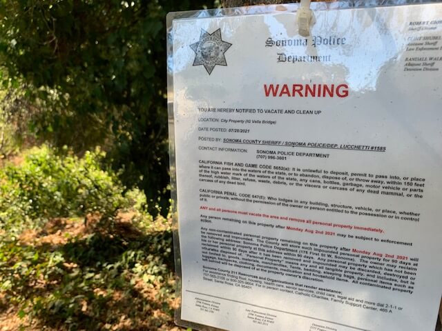 A sweep of homeless camps, like this one beneath Sonoma’s Ig Vella Bridge, was carried out on September 1. Those encamped in the Montini Preserve and other areas, writes Supervisor Susan Gorin, “were given notice to leave the preserve given the significant safety risks for both the residents and the community at large. Residents were offered shelter space at COTS in Petaluma, or placed on waiting lists for other shelters in the County.”
