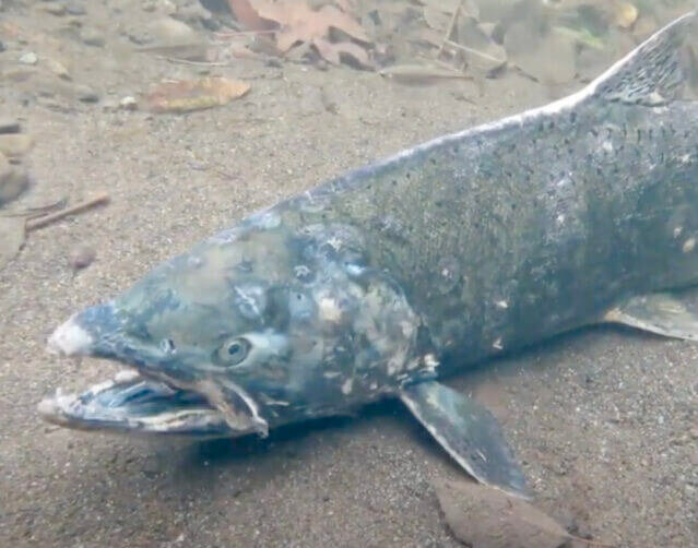 The Chinook salmon that have been making their run up the Sonoma Creek watershed are reaching the end of their life cycle. In a Sonoma Ecology Center video, you can catch a glimpse of changes their bodies undergo after navigating many miles of estuary and stream. Their tail fins are particularly damaged from beating repeatedly against rocks; By the end of their long trip, lesions begin to develop on the skin and mouth as the salmon begin to lose their health.