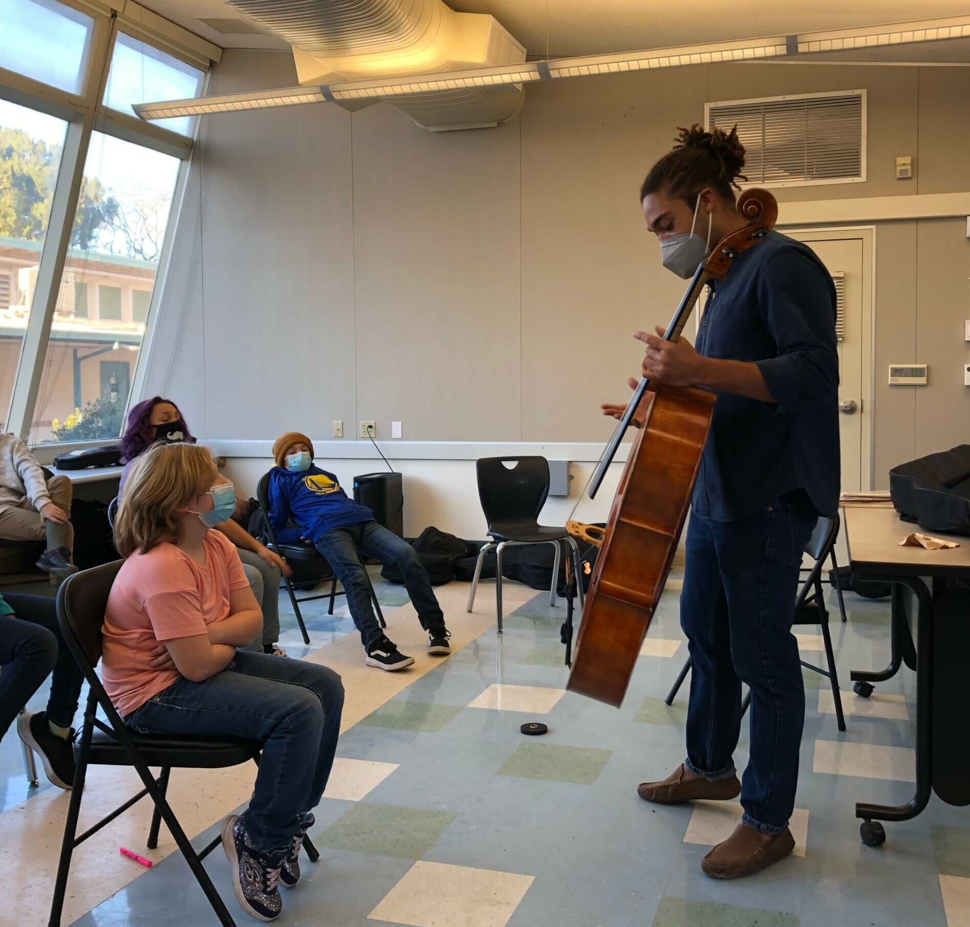 Michael Fecskes of Valley Vibes Youth Orchestra leads the first day of cello class at Dunbar Elementary School.
