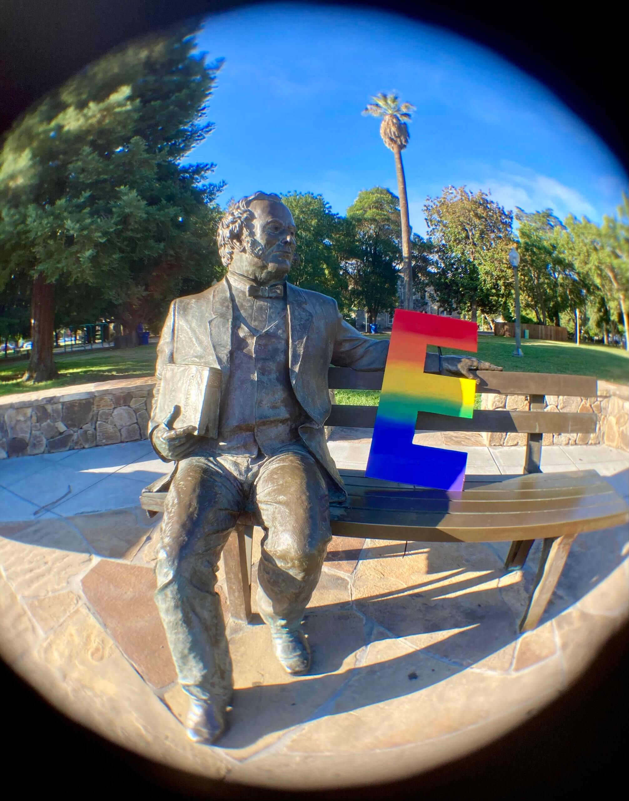 There’s something a little off about The Sonoma Cheese Factory, namely the ‘E’ in cheese, on the building’s sign. The locale is a major draw, perched as it is on The Plaza. And certainly there’s been plenty of time to fix (at nominal charge; it’s not neon) the bit of blight. But, and this is true of his many other neglected properties around the Valley, owner Ken Mattson doesn’t really care how it embarrasses the town. Lately the gorilla campaign to ‘Put the E back in Cheese’ has emerged, with a pop-up banner, and of course the guy painted yellow carrying a protest sign. For Pride month, there was even a rainbow E, a comment on the Mattson family views on gay rights. It was last seen in the company of General Vallejo, keeping watch on the building from his permanent post across the street. At this point the general might be easier to move than the Mattson company.