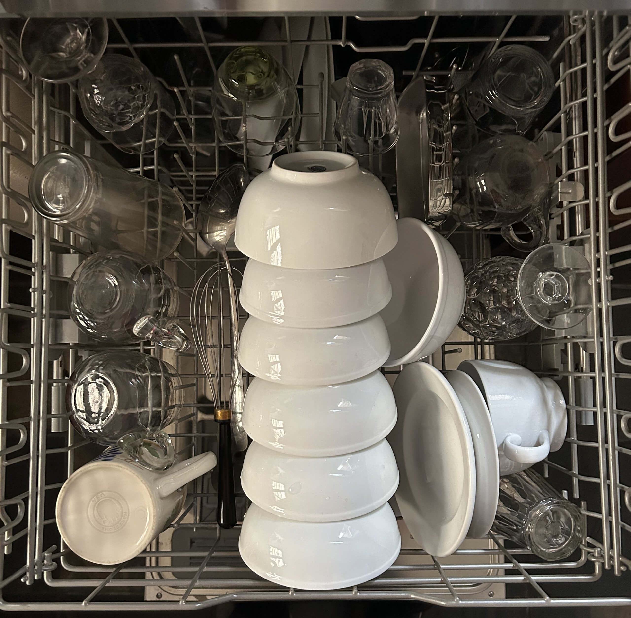 For example, finding cereal bowls where the cups are supposed to be, or drinking glasses in the plate slots. These are the sure signs of an amateur. The chess master, on the other hand, places each item to maximize the potential of the number of total items placed in the machine. For example, there’s the small saucer gambit: back-to-back in the gap between the bowl holders and the spot for cups and glasses.