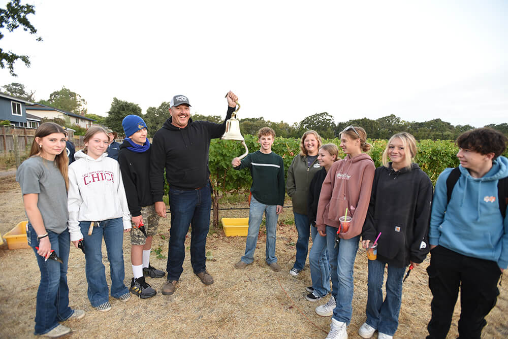 Helping with the harvest were members of the Sunrise Rotary Club, including former NFL standout Tony Moll, now a partner in Three Fat Guys Winery, where McMahon is head winemaker. McMahon’s son Jack is president of the Future Farmers of America chapter, which is closely tied to the SVHS ag program, and involves some 250 students. Moll got the harvesting session underway with the traditional ringing of a ceremonial brass bell.