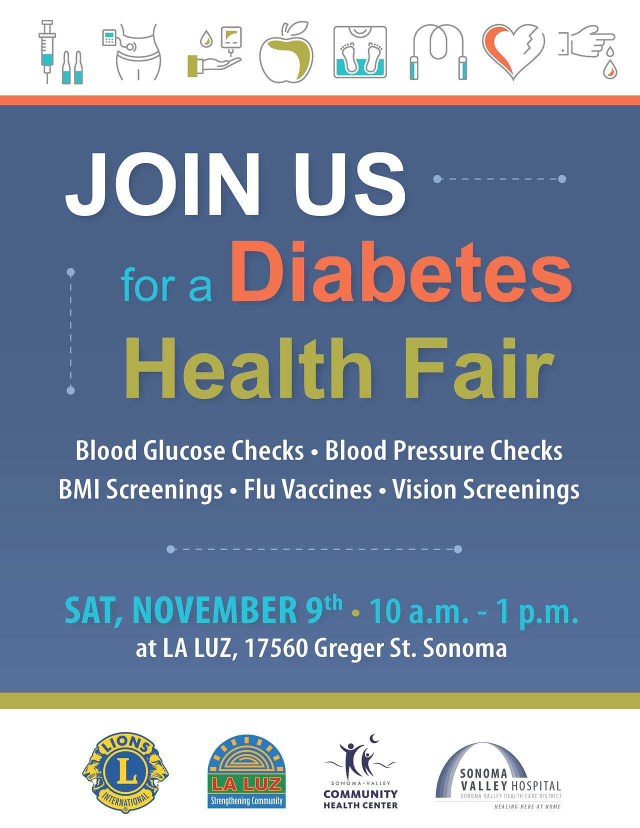 Understanding diabetes and getting a proper diagnosis is essential to stop the progression of the disease. Many people with diabetes don’t realize they have it until it has progressed too far to prevent damage to their bodies. Living with diabetes requires careful eating of low-glycemic foods, maintaining a proper weight, daily testing of one’s blood glucose level, getting regular exercise and receiving proper medical care. This Diabetes Health Fair is an opportunity for the public to learn more about this disease and its control. The fair will be held at La Luz, 17560 Greger Street, Sonoma from 10a.m. to 1p.m., November 9, 2024.