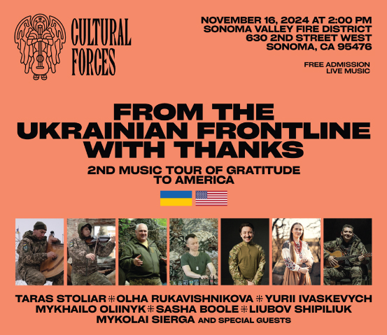 The concert is hosted by Sonoma Fire Department Chief Steve Acre. It is part of the gratitude tour of Ukraine to the United States to express thanks for all the support provided to Ukraine during the war, including the gift to Sonoma of an ambulance recently donated to Sonoma’s sister city Kaniv, by The City of Sonoma and the Sonoma Fire Department.
