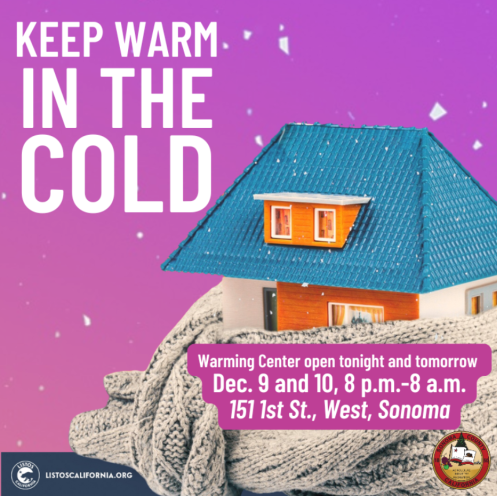 With colder weather expected over the next few days, the County of Sonoma, in partnership with the City of Sonoma, will open an Emergency Warming Center on Monday and Tuesday nights.