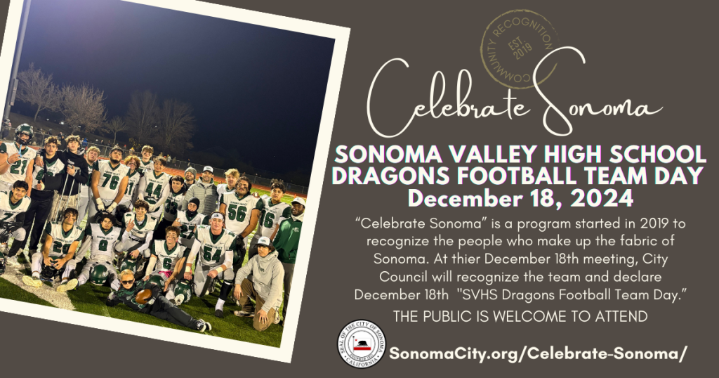The City of Sonoma is excited to announce that the Sonoma Valley High School Dragons Football Team will be the next honorees in the “Celebrate Sonoma” program. Sonoma City Council will recognize the team during the Sonoma City Council meeting on Tuesday, December 18, 2024, at 6:00 PM in Council Chambers.