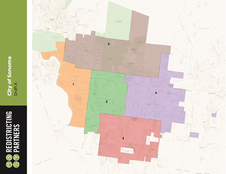 The city has engaged Redistricting Partners to assist in the process by analyzing the balance of number of voters, ethnicity, and other factors in the designation of proposed districts. A decision about whether to create four or five districts has not yet been made, and maps showing both approaches will be considered. The city solicited public participation in mapping ideas, and the are all available to view at https://www.sonomacity.org/district-maps/.