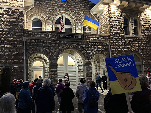 More than 75 people gathered in front of Sonoma City Hall on the cold, rainy evening of February 24 in vigil for Ukraine on the third anniversary of the country’s invasion by Vladimir Putin’s Russian forces. The event to honor and appreciate the courage of the Ukrainian people opened with Taras Lumier singing the Ukrainian national anthem. Many in the crowd held candles which they struggled to keep lit in the blustery winds. The event was sponsored by Sonoma Sister Cities, Kaniv Committee. Kaeti Bailie, from the Sister Cities Board, welcomed people to the vigil.