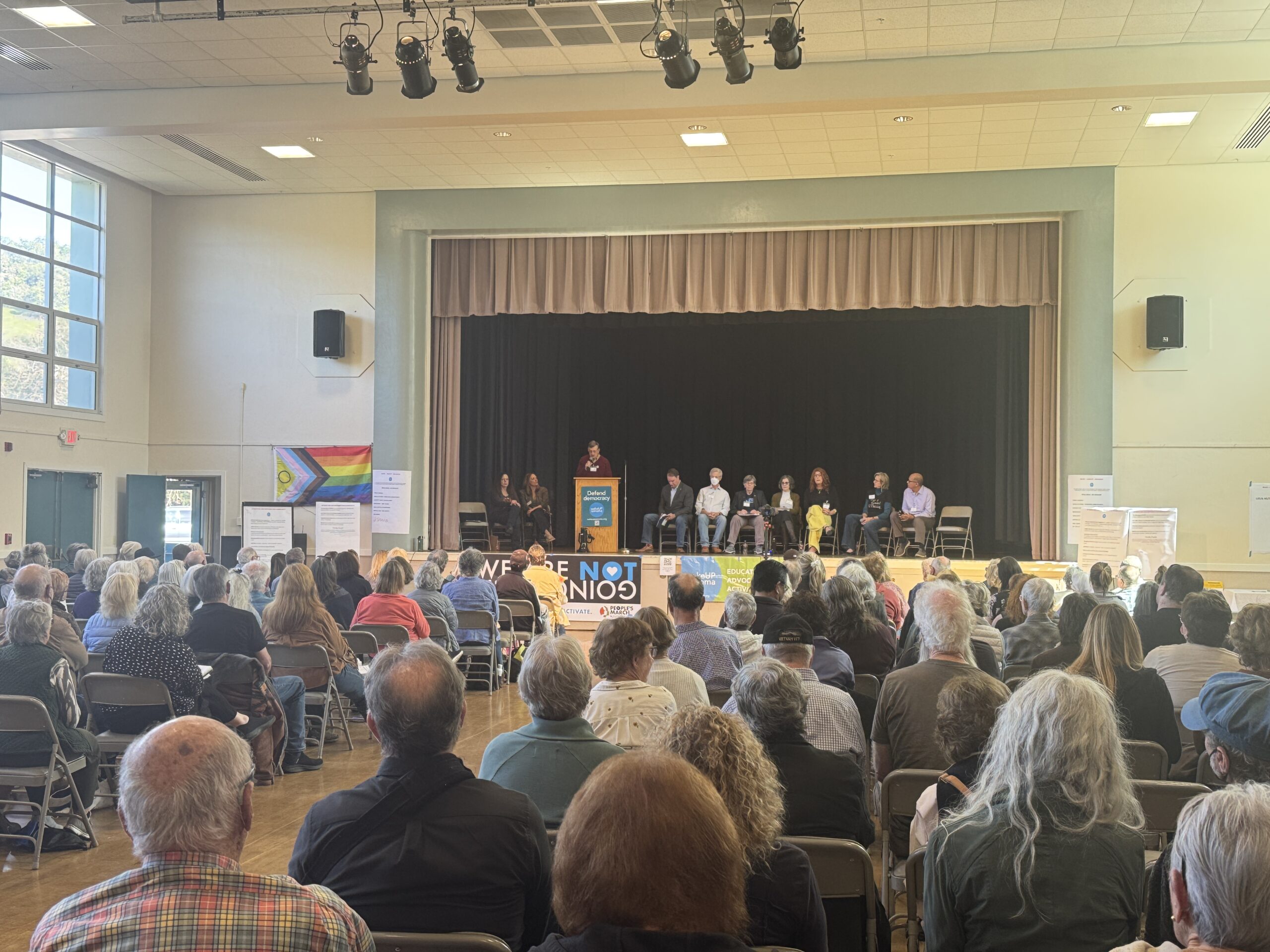 President of Wake UP Sonoma Lisa Storment greeted the almost 400 people who filled the Vets Building on Sunday afternoon March 9 for a Town Hall, with the affirmation that the size of the turnout was a good indicator of “our level of concern, shock, grief and anger about where we find ourselves in this moment.” She pointed out that similar gatherings are taking place in communities around the nation, gatherings at which people have resolved to move into autonomous direct action, seeking a constructive response to the barrage of actions emanating from Washington, D.C., following the plan laid out in Project 2025. “Even though they are taking a wrecking ball to our Democracy – deep down I know – and I know you all know – that our democracy is stronger than their craziness. Coming together today is our democracy in action.”