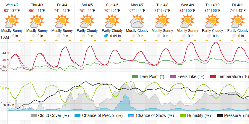 After a series of late March rain, wind, and even hail storms, this week will bring warming temperatures, forecast to reach above 80 degrees later within the next seven days.