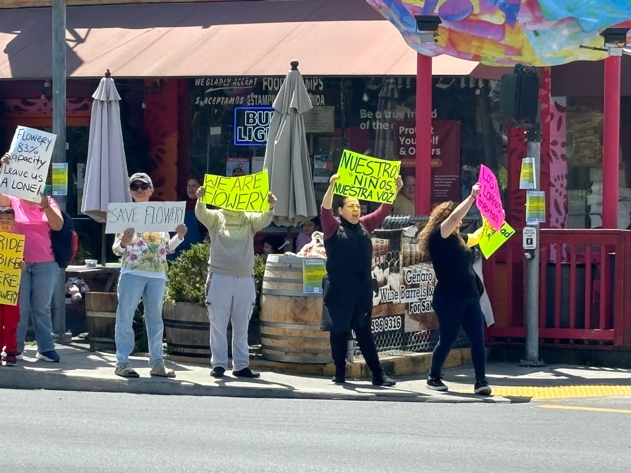 Forty mothers, fathers and grandparents, plus a dozen children, held up signs to protest the impending decision to close their school. Standing in front of El Brinquito, on Highway 12 at the corner of Depot Road from 12:30 – 2:00 on May 7, these Flowery families gathered in the hopes of persuading the Sonoma Valley Unified Board of Trustees to abandon a plan to close the Flowery site and make a wholesale transfer of all the students who comprise the Dual Immersion (DI) academic program, to Sassarini School. The proposed move would displace many of the current Sassarini students and teachers.