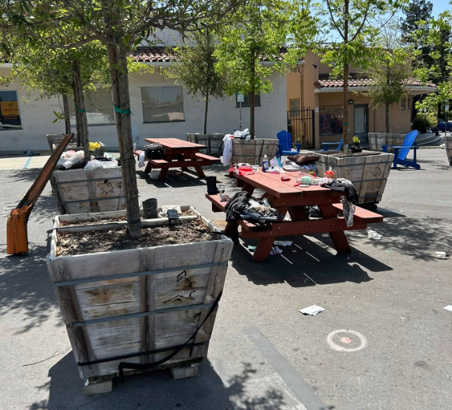 Reaching out on social media a “cleaning crew” was formed: Me, Georgeann Quinn, Megie Marvel, Lisa Trembly (and the Springs Rotary), Hannah Aclufi and Judie Osborn-Shaw. Since January 2025 we have been taking turns each week to clean the area. With gloves, buckets, brooms we do our best to pick up trash and place it in the Recology receptacles the county has provided. From day one it has been a challenge. In the real world nothing is perfect. People throw trash on the ground, dump large objects, the un-housed camp on the sidewalks by the Mattson buildings, people do not read the signs and dump trash in recycling and compostable waste bins and vice versa and the area that is gated and locked between the two building was already full of trash. We have figured out some solutions amongst ourselves, and with the help of our new supervisor, Rebecca Hermosillo. The adjacent property owner secures the trash receptacles, unlocks and places them out on the proper day for pick up. The owner of the barber shop let me into the locked area between the buildings to remove the trash.