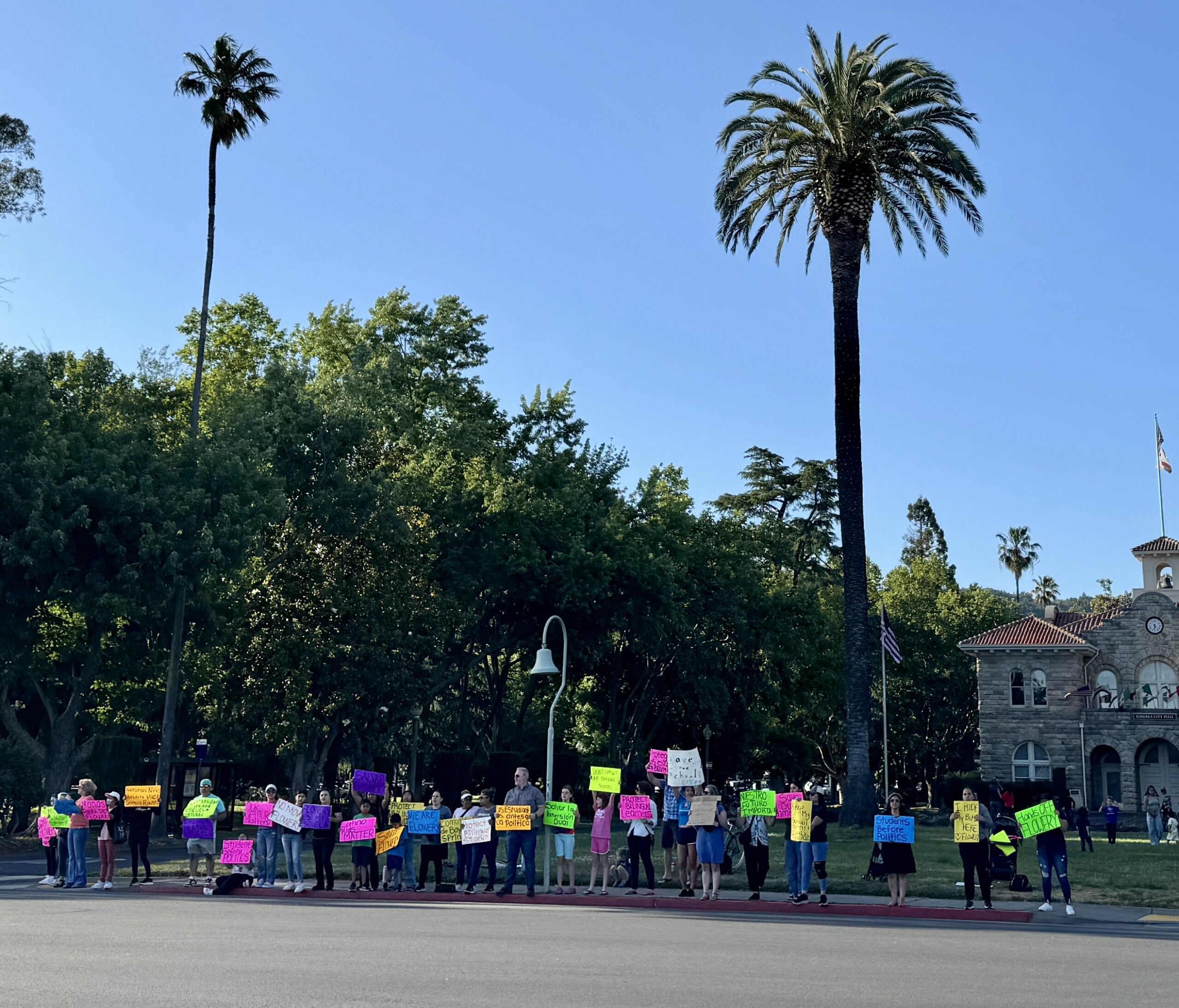 Flowery School parents, students, grandparents and graduates gathered at Sonoma Plaza Friday, May 23 to protest the Sonoma Valley Unified School Trustees’ vote to close, in June 2026, the bilingual elementary school located in the heart of the Springs. Protest organizer Nancy Íñiguez said they came to the Plaza so more people could see who they are and what they are standing for. Protestors held up signs with a variety of messages, some in English and others in Spanish, including “Our Future Matters,” “Our Children, Our Voice, We are Flowery,” “Don’t Move Us” and “Latino Kids Matter.”