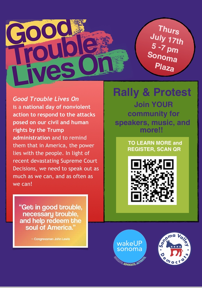 RALLY TO BE FOLLOWED BY: A March down Broadway in Sonoma Valley. We will march for visibility as we make good trouble. Bring noisemakers, Powerful signs with our demands, and a vision of the future we want.
