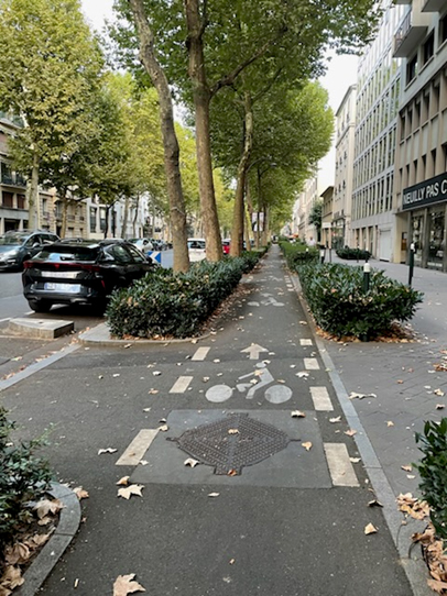 Here in Neuilly, I walk past corridors where bike paths are tucked under rows of tall plane trees, set apart from cars by low hedges and greenery. People sit on benches beneath the shade, parents push strollers, and cyclists ride in calm rather than chaos. Cars still pass by, but the rhythm of the street feels different — quieter, more balanced. Seeing it here makes me wonder what 5th Street West could feel like if we gave it that same attention.