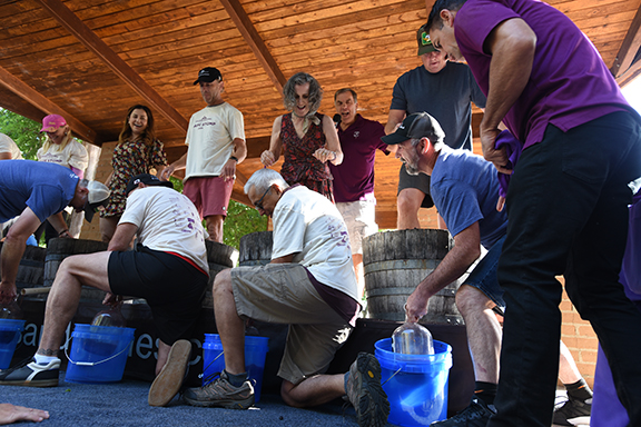The event was completely sold out, with 72, two-person teams competing to see who can produce the most grape juice into a one-gallon jug in three minutes. The barefoot competition puts one team member in the barrel to stomp the grapes, and a second “swabber” who scoops the juice toward the spout. This year a beautiful bounty of Zinfandel was divided into five-gallon buckets for each of the six barrels per round. The “Celebrity Stomp,” which included Sonoma Mayor Patricia Farrar-Rivas, was won by the Blazer Team.