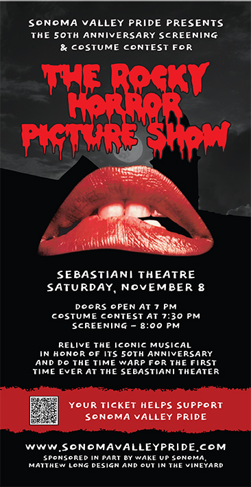 “This event is more than just a movie screening—it’s a celebration of queer joy, camp, and community,” said Matthew Long of Sonoma Valley Pride. “We’re thrilled to bring Rocky Horror to the Sebastiani Theatre which first showed the film 35 years ago. We can’t think of a better way to mark its 50th anniversary than by doing the ‘Time Warp’ together in Sonoma Valley.”