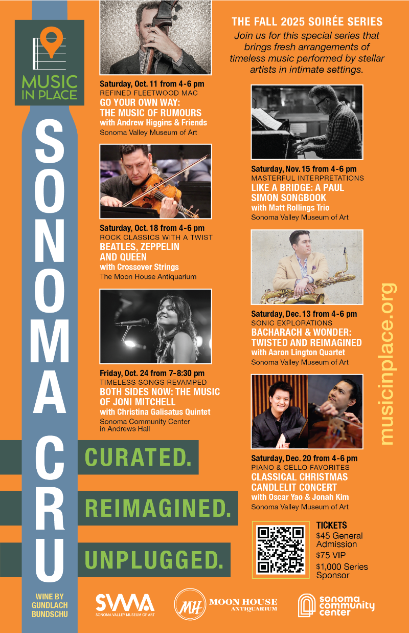 - Up-close performances in beloved Sonoma venues: the Sonoma Valley Museum of Art, the Moon House Antiquarium and the Sonoma Community Center