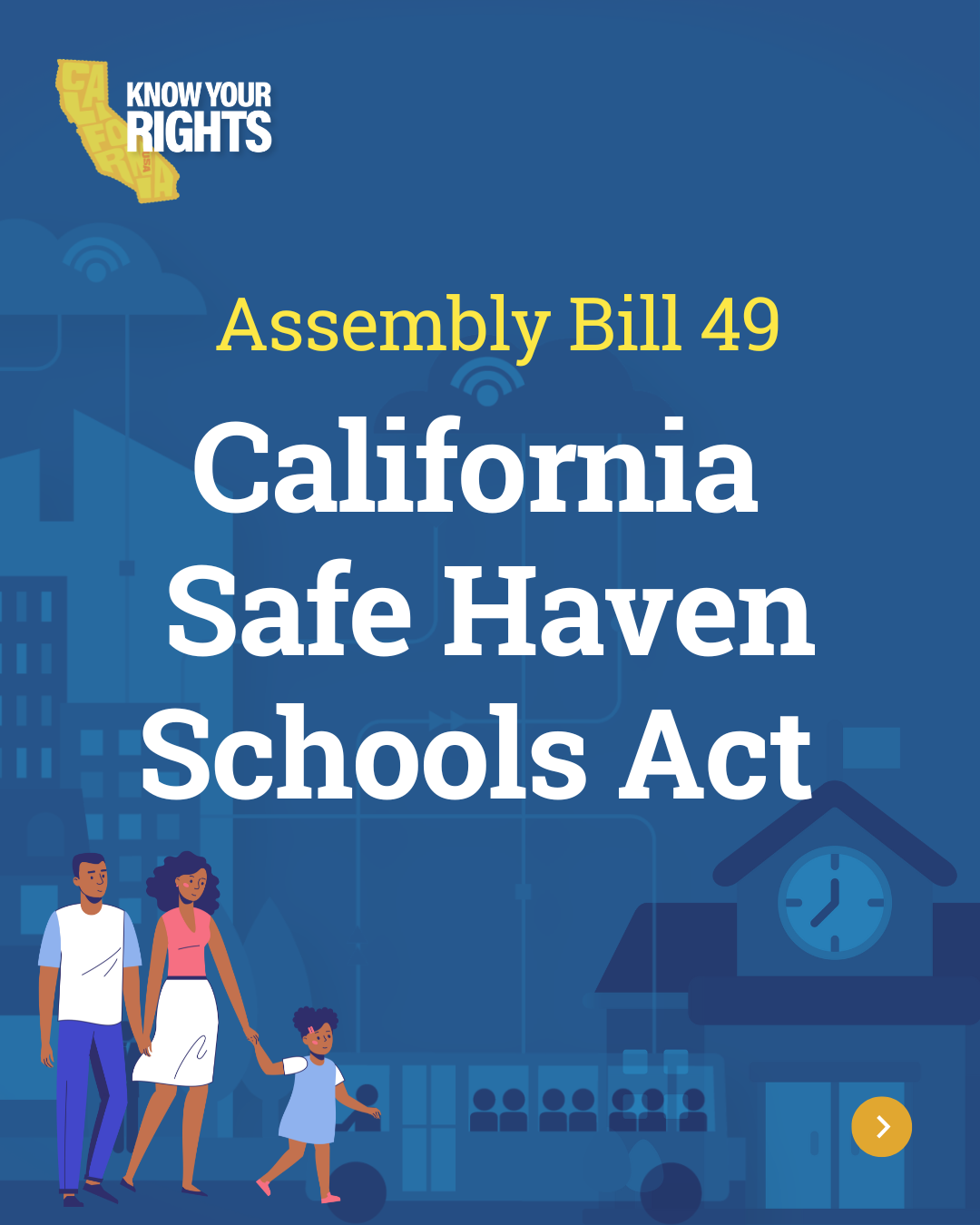 AB 49 prohibits Local Educational Agency employees from allowing immigration authorities to enter a nonpublic area of a school site without being presented with a valid judicial warrant, judicial subpoena or a court order, or unless required by state or federal law. SB 98 requires communication to pupils, families, faculty, staff, and other school community members if an immigration enforcement agent is present on a school site.