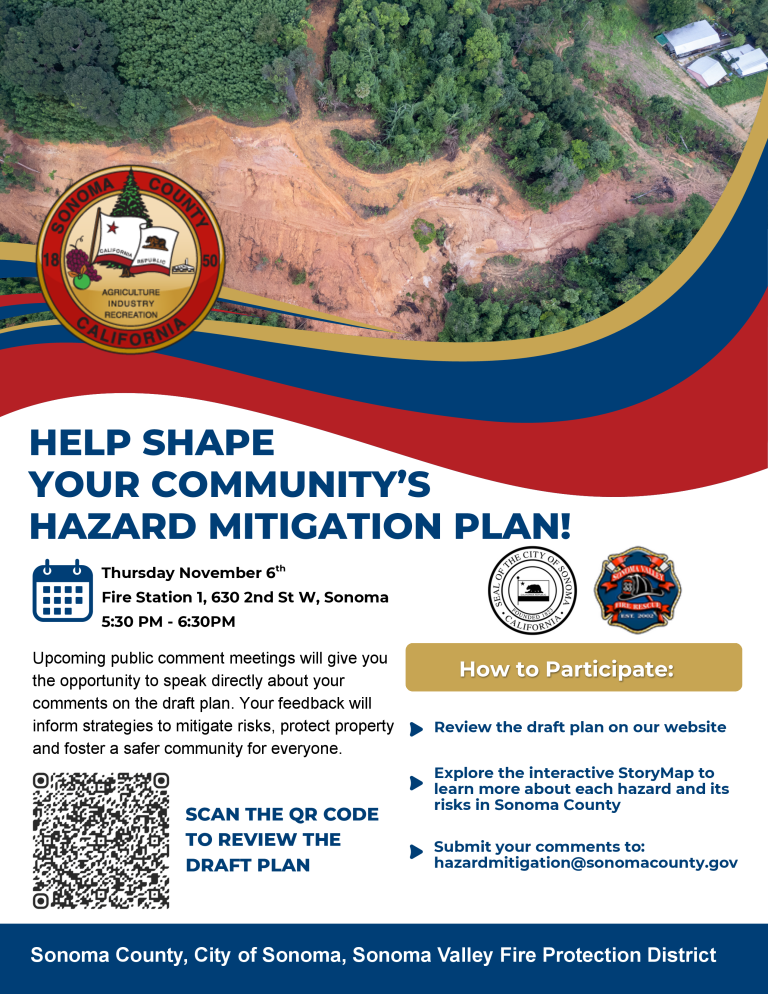 The MJHMP is a countywide effort involving 22 jurisdictions, including the City of Sonoma and the Sonoma Valley Fire District, both of which have annexes in the draft plan. The plan identifies local risks from natural and human-caused hazards and outlines strategies to reduce future disaster impacts.