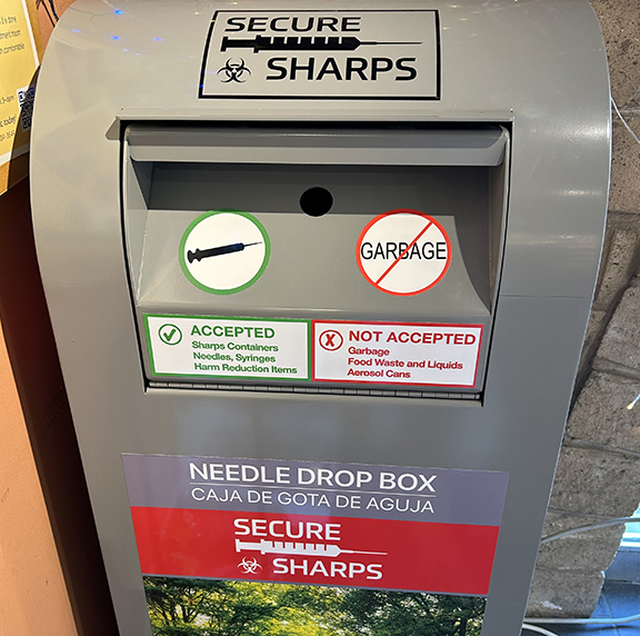 The device is located just inside the front door of Adobe Drugs, which is open six days a week. Needles and other “sharps” can be deposited in the receptacle, and users can place them in other containers at home before bringing them in. The disposal unit has a large “door” and items placed inside are transferred to a secure inner container.