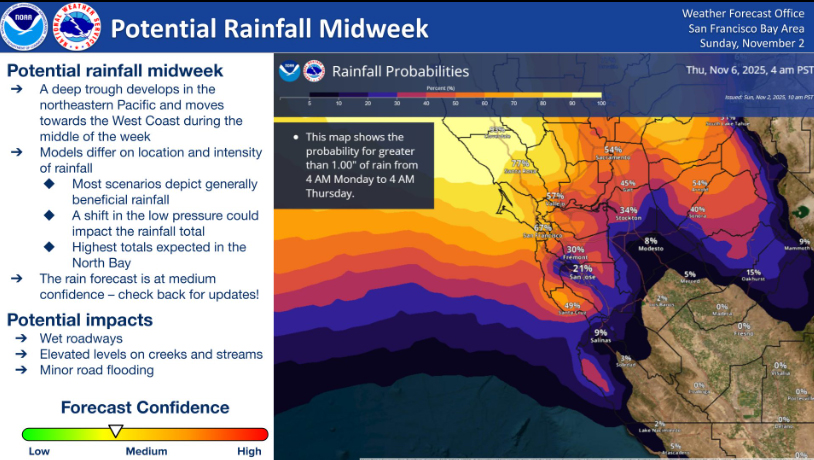 The current forecast for the coming week includes a significant storm packing nearly an inch of rain, and gusty winds. Now is a good time to check your gutters, and remove any objects that can be damaged by wind or rain from outside. The storm is expected to impact our area late Tuesday night and Wednesday.