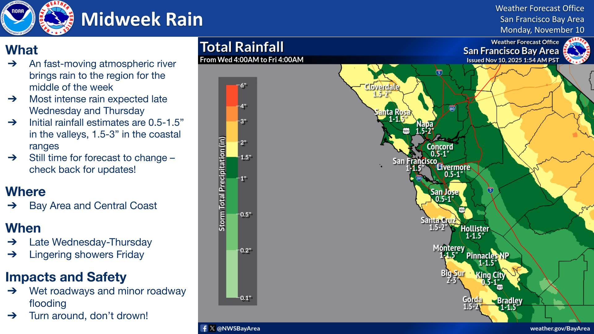Another round of wet weather is coming our way, and this time we may see well over an inch of rain. NOAA reports that a quick-hitting atmospheric river will bring moderate rain, strong south winds, and a slight chance of thunderstorms late Wednesday through Thursday. Still time for the details to be refined, but minor flooding and some power outages are possible.