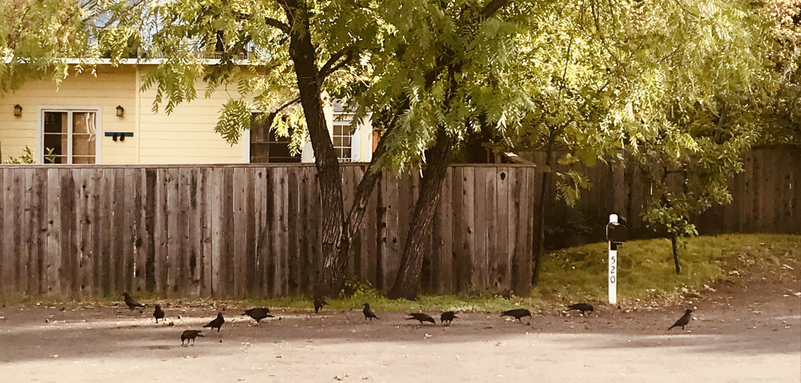 First I hear them, croaking and clucking from atop a metal light post, wooden telephone pole or one of the purple plum trees out front. Then I see them feast and skirmish from the porch as I sip coffee and read the newspaper in the warm late autumn sun. The crew of crows come to our block only during these pivotal weeks when the sunlight shifts from the backyard to the front and shines more golden. The clever crows know when the walnuts are ready for eating.