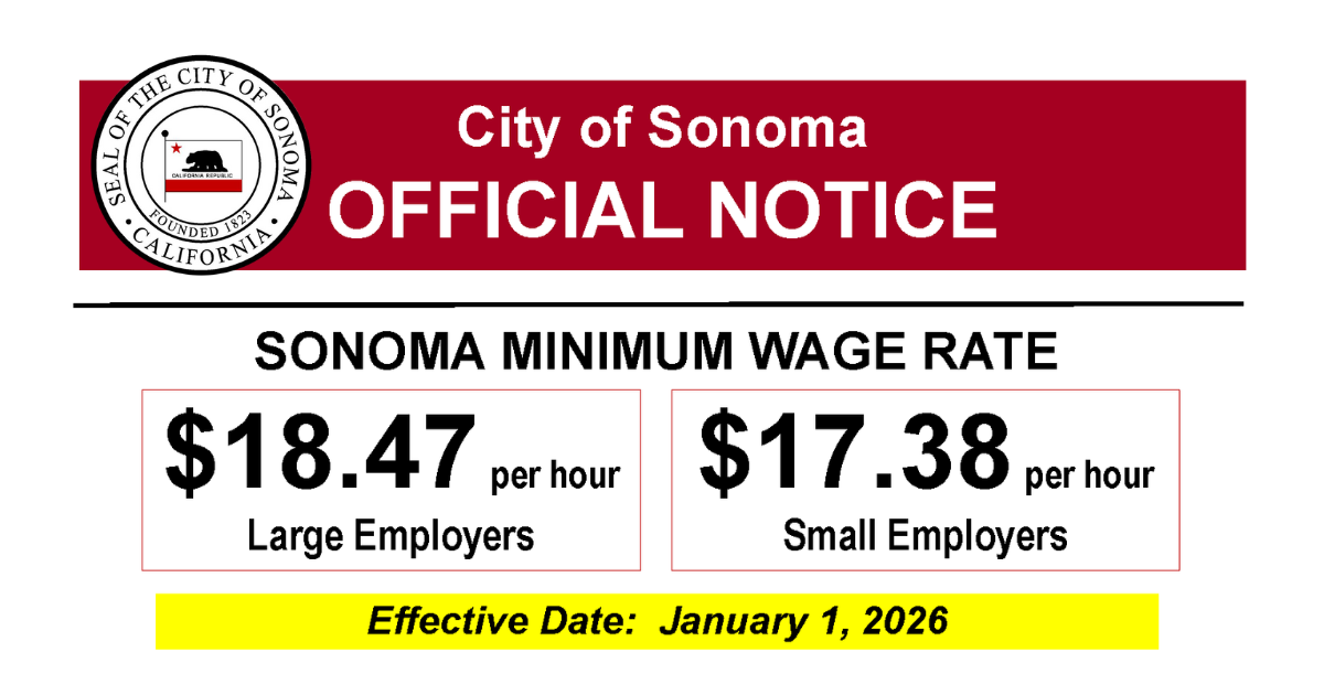 The scheduled increase is included in the minimum wage ordinance adopted by the City Council in 2019 after a minimum wage study, which became Chapter 2.80 of the Sonoma Municipal Code.