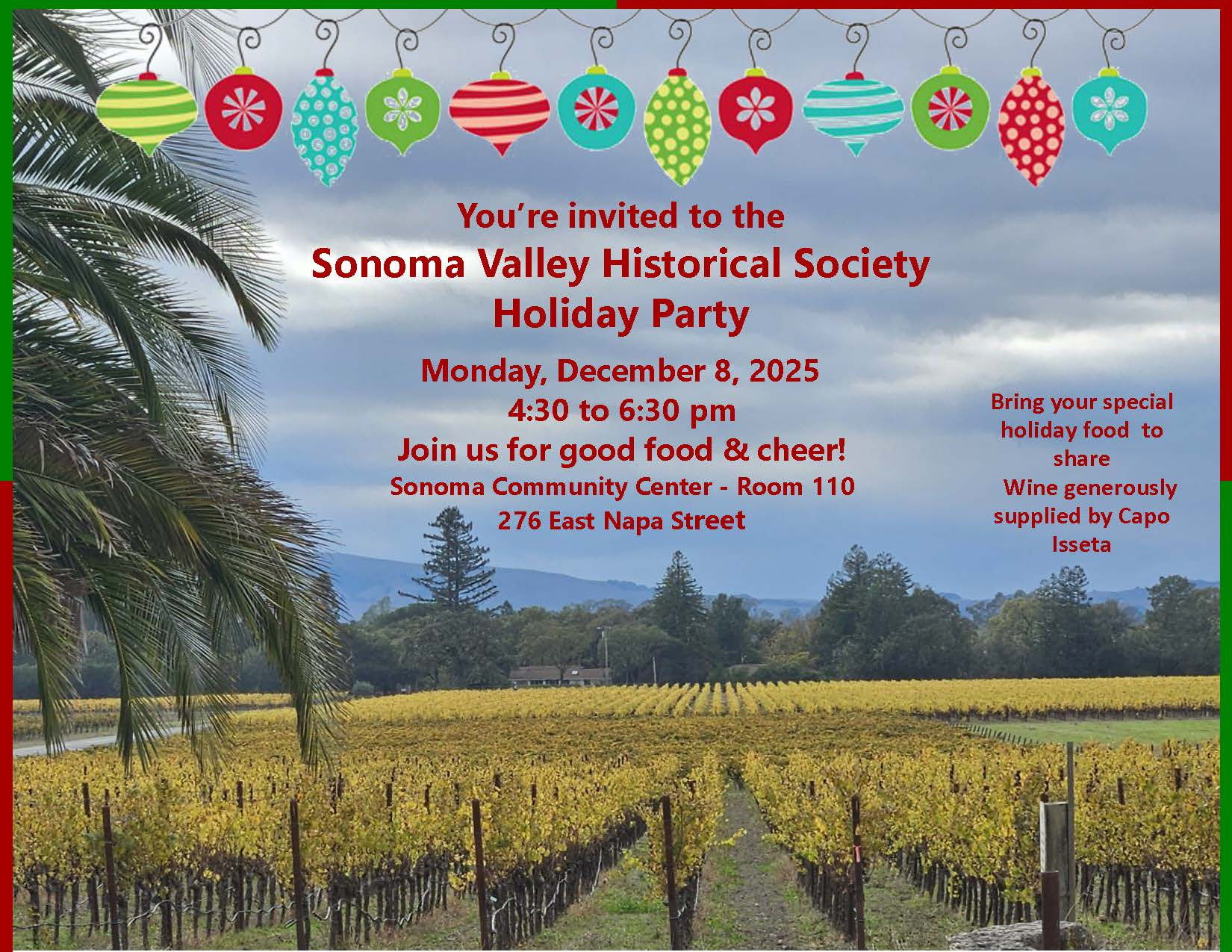 S.V. Historical Society Holiday Party 12/8 – 4:30-6:30 At the Sonoma Community Center, room 110 More from Events & EntertainmentMore posts in Events & Entertainment »Praxis Event: Aaron Perry – Our Biggest Deal: Pathways to Planetary ProsperityPraxis Event: Aaron Perry – Our Biggest Deal: Pathways to Planetary ProsperityScrooge, the Musical: DecemberScrooge, the Musical: DecemberHoliday Serenades on the PlazaHoliday Serenades on the PlazaSonoma Valley Chorale Concert ScheduleSonoma Valley Chorale Concert Schedule